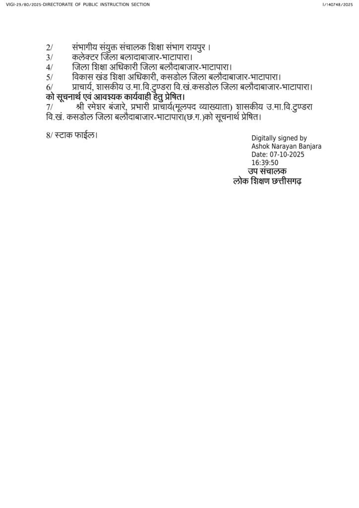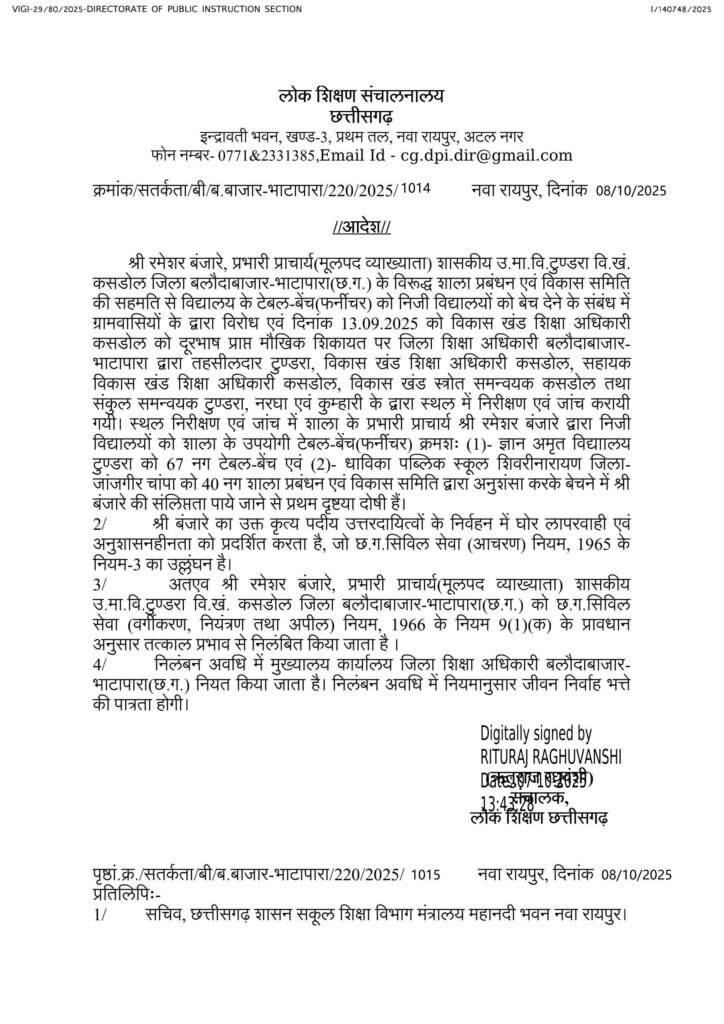 स्कूल का फर्नीचर बेचने के मामले में शासकीय उच्चत्तर माध्यमिक विद्यालय टुण्डरा के प्रभारी प्राचार्य रमेशर बंजारे को संचालक लोक शिक्षण द्वारा निलंबित कर दिया गया है।प्राप्त जानकारी के अनुसार शासकीय उच्चत्तर माध्यमिक विद्यालय टुण्डरा के प्रभारी प्राचार्य रमेशर बंजारे के विरूद्ध शाला प्रबंधन एवं विकास समिति की सहमति से विद्यालय के टेबल-बेंच (फर्नीचर) को निजी विद्यालयों को बेच देने के संबंध में ग्रामवासियों के द्वारा विरोध एवं दिनांक 13.09.2025 को विकासखंड शिक्षा अधिकारी कसडोल को दूरभाष प्राप्त मौखिक शिकायत पर जिला शिक्षा अधिकारी बलौदाबाजार-भाटापारा द्वारा तहसीलदार टुण्डरा, विकास खंड शिक्षा अधिकारी कसडोल, सहायक विकासखंड शिक्षा अधिकारी कसडोल, विकासखंड स्त्रोत समन्वयक कसडोल तथा संकुल समन्वयक टुण्डरा, नरघा एवं कुम्हारी के द्वारा स्थल में निरीक्षण एवं जांच करायी गयी। स्थल निरीक्षण एवं जांच में शाला के प्रभारी प्राचार्य रमेशर बंजारे द्वारा निजी विद्यालयों को शाला के उपयोगी टेबल-बेंच (फर्नीचर) ज्ञान अमृत विद्याालय टुण्डरा को 67 नग टेबल-बेंच एवं धाविका पब्लिक स्कूल शिवरीनारायण जिला-जांजगीर चांपा को 40 नग शाला प्रबंधन एवं विकास समिति द्वारा अनुशंसा करके बेचने में श्री बंजारे की संलिप्तता पाये जाने से प्रथम दृष्टया दोषी पाया गया। प्रभारी प्राचार्य के उक्त कृत्य को पदीय उत्तरदायित्वों के निर्वहन में घोर लापरवाही एवं अनुशासनहीनता माना गया जो छतीसगढ़ सिविल सेवा (आचरण) नियम, 1965 के नियम-3 का उल्लंघन है।परिणामस्वरूप रमेशर बंजारे, प्रभारी प्राचार्य को छत्तीसगढ़ सिविल सेवा (वर्गीकरण, नियंत्रण तथा अपील) नियम, 1966 के नियम 9(1) (क) के प्रावधान अनुसार तत्काल प्रभाव से निलंबित किया गया है।निलंबन अवधि में मुख्यालय कार्यालय जिला शिक्षा अधिकारी बलौदाबाजार-भाटापारा नियत किया गया है। निलंबन अवधि में नियमानुसार जीवन निर्वाह भत्ते की पात्रता होगी।