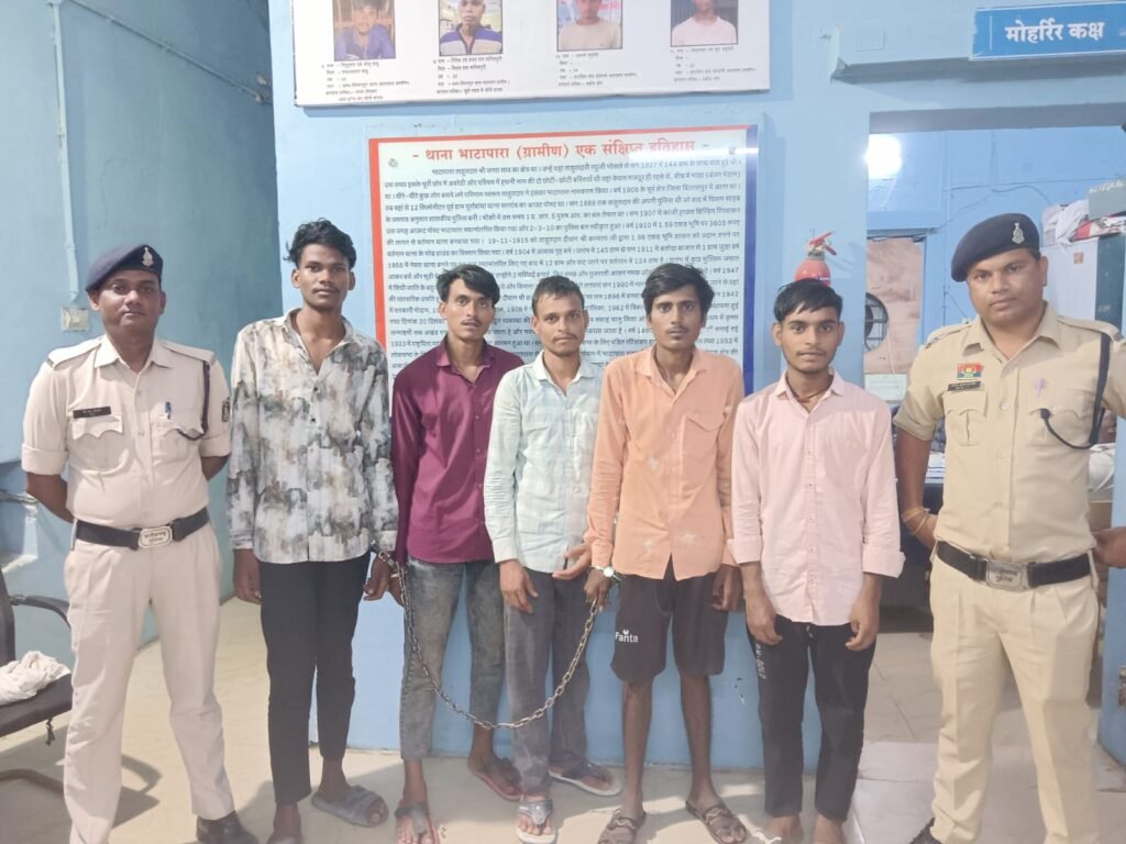 दिनांक 01.10.2025 को प्रार्थी रविशंकर वर्मा निवासी परशुराम वार्ड भाटापारा द्वारा रिपोर्ट दर्ज कराया गया कि जिला सहकारी बैंक निपनिया में रात्रि ड्यूटी कर अपनी मोटरसाइकिल क्र. CG22 AC 7075 से दिनांक 01.10.2025 को सुबह 05:00 वापस अपने घर आ रहा था। कि सूरजपुरा गेट के पास 02 मोटरसाइकिल में आरोपी आए तथा प्रार्थी को रोक कर अश्लील गाली गलौज करते हुए हाथ मुक्का एवं बेल्ट से मारपीट किए हैं। साथ ही आरोपियों द्वारा प्रार्थी की मोटरसाइकिल एवं उसकी जेब में रखे ₹1500 को लूट कर फरार हो गए। कि रिपोर्ट पर थाना भाटापारा ग्रामीण में अपराध क्र. 627/2025 धारा 310(2),126(1),296,115(2) बीएनएस का प्रकरण पंजीबद्ध कर विवेचना में लिया गया।कि प्रकरण में पुलिस अधीक्षक श्रीमती भावना गुप्ता के कुशल निर्देशन में थाना भाटापारा ग्रामीण पुलिस द्वारा डकैती की घटना को अंजाम देने वाले आरोपियों का पता तलाश प्रारंभ किया गया। साथ ही घटनास्थल के आसपास लगे सीसीटीवी फुटेज का भी गहन अवलोकन किया गया एवं प्रार्थी से विस्तृत पूछताछ एवं उसके द्वारा बताए गए हुलिए के आधार पर प्रकरण में संलिप्त 01 अपचारी बालक सहित 06 आरोपियों को हिरासत में लिया गया, जिनसे पूछताछ करने पर आरोपियों द्वारा प्रार्थी के साथ मारपीट कर, उसकी मोटरसाइकिल एवं नगदी रकम लूटकर डकैती की घटना करना स्वीकार किया गया। साथ ही आरोपियों से प्रकरण में लूट गए मोटरसाइकिल को जप्त किया गया है। कि प्रकरण में आरोपियों को विधिवत गिरफ्तार कर माननीय न्यायालय के समक्ष प्रस्तुत करने की प्रक्रिया की जा रही है।आरोपियों के नाम 1. पुनीत ध्रुव उम्र 19 साल निवासी ग्राम दतरेंगा थाना भाटापारा ग्रामीण 2. ठनेश्वर कुमार साहू उम्र 18 साल निवासी ग्राम दतरेंगा थाना भाटापारा ग्रामीण3. युगल कुमार वैष्णव उम्र 18 साल निवासी ग्राम दतरेंगा थाना भाटापारा ग्रामीण4. मनोज कुमार साहू उम्र 21 साल निवासी ग्राम दतरेंगा थाना भाटापारा ग्रामीण5. प्रेम कुमार वैष्णव उम्र 24 साल निवासी ग्राम दतरेंगा थाना भाटापारा ग्रामीण6. अपचारी बालक 01 नफर