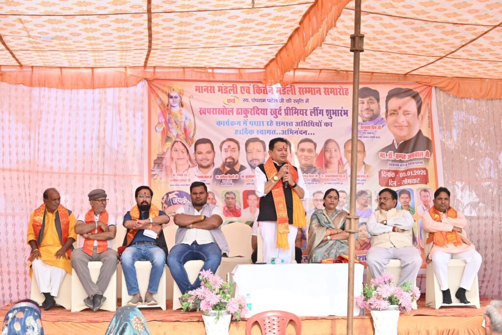पिथौरा- ठाकुरदिया खुर्द में आयोजित रामायण मंडली और कीर्तन मंडली सम्मान समारोह एवं खपराखोल ठाकुरदिया प्रीमियर लीग का शुभारंभ मुख्य अतिथि बसना विधायक डॉक्टर संपत अग्रवाल अध्यक्षता कर रही जनपद पंचायत अध्यक्ष उषा पुरुषोत्तम घृतलहरे विशिष्ट अतिथि जनपद उपाध्यक्ष ब्रह्मानंद पटेल भाजपा जिला प्रवक्ता स्वप्निल तिवारी वरिष्ठ भाजपा नेता सीताराम सिन्हा डा किशोर सिंहा विधायक प्रतिनिधि सुरेंद्र पांडे कामेश बंजारा खेमू अग्रवाल,सरपंच मनोज सिन्हा आयोजक अजय नायक ने श्री रामचंद्र के छाया चित्र पर माल्यार्पण कर पूजन अर्चन कर कार्यक्रम का शुभारंभ किया।कार्यक्रम को संबोधित करते हुवे मुख्य अतिथि के आसंदी से बसना विधायक सम्पत अग्रवाल ने कहा कि सनातन को आगे बढ़ाने ऐसे आयोजन आवश्यक है आयोजक समिति इसके लिये बधाई के पात्र है रामायण मंडलीय और कीर्तन मंडलियों का सम्मान करना हम सब के लिये सौभाग्य की बात है इस अवसर पर विधायक सम्पत अग्रवाल व मंचस्थ अतिथियों ने 51 ग्रामों से आए धर्मप्रेमी मानस मंडली एवं कीर्तन मंडली के प्रमुखों का संपन्न किया। कार्यक्रम की भूरी भूरी प्रशंसा करते हुए प्रभु श्रीरामचन्द्र जी के मंदिर निर्माण के लिए शुभकामनाएं दी। इस पावन अवसर पर संयोजक अजय नायक,टीकम सिक्या , डॉ शेषनारायण सेन, देशराम निराला,रामेश्वर पटेल,बंशीधर नायक,रूपेश नायक,राजेश ठाकुर,केशव पटेल,केशव साहु,लोकेश नायक, हेम सागर, लक्ष्मी पटेल,निर्मला पटेल,साहेबलाल नायक, टुकलाल पटेल,नरेश शुक्ला,जागेश्वर पटेल,हीरालाल मिर्धा,मुंगेश्वर पटेल एवं प्रभु श्रीरामचन्द्र सनातन चेतना संस्थान समिति ठाकुरदिया खुर्द के सदस्यों सहित समस्त ग्रामवासी उपस्थित थे।