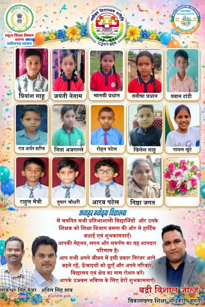 विकासखण्ड बसना के लिए अत्यंत हर्ष का विषय है कि इस वर्ष जवाहर नवोदय विद्यालय चयन परीक्षा में कुल 14 विद्यार्थियों का चयन हुआ है। इन प्रतिभाशाली विद्यार्थियों ने अपनी मेहनत,लगन और अनुशासन के बल पर यह उल्लेखनीय सफलता प्राप्त की है।चयनित विद्यार्थियों में शासकीय प्राथमिक शाला करनापाली से प्रियांश साहू व जयंती नेताम, प्राथमिक शाला दुरूगपाली से मानवी प्रधान व तनीषा प्रधान,सरस्वती शिशु मंदिर रसोड़ा यवान टांडी, प्राथमिक शाला उमरिया से राज आर्यन बारीक,अल्फा ओमेगा भंवरपुर से राहुल मैत्री,तुषार चौधरी,आरव पटेल,सरस्वती शिशु मंदिर भंवरपुर से निष्ठा जगत, प्राथमिक शाला पिताईपाली से नीता अजगल्ले,प्राथमिक शाला बिजराभांठा से रोहन पटेल,प्राथमिक शाला गिधली से खिलेश साहू एवं एकलव्य विद्यालय भंवरपुर से पायल खूंटे का चयन हुआ है।