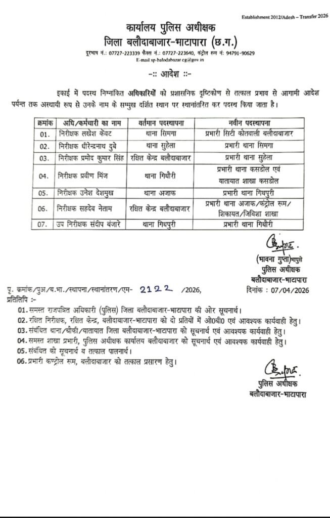 बलौदाबाजार-भाटापारा, 7 अप्रैल 2026।जिले में पुलिस प्रशासन को मजबूत करने के उद्देश्य से पुलिस अधीक्षक द्वारा बड़ा प्रशासनिक फेरबदल किया गया है। जारी आदेश के अनुसार 7 पुलिस अधिकारियों का तत्काल प्रभाव से स्थानांतरण किया गया है।जारी सूची के अनुसार निरीक्षक लखेश केवट को थाना सिमगा से प्रभारी सिटी कोतवाली बलौदाबाजार भेजा गया है। वहीं निरीक्षक धीरेंद्रनाथ दुबे को थाना सुहेला से सिमगा का प्रभारी बनाया गया है। निरीक्षक प्रमोद कुमार सिंह को रक्षित केंद्र से थाना सुहेला की जिम्मेदारी दी गई है।इसके अलावा निरीक्षक प्रवीण मिंज को थाना गिधौरी से कसडोल थाना एवं यातायात शाखा का प्रभार सौंपा गया है। निरीक्षक उदेश देशमुख को थाना अजाक से गिदपुरी का प्रभारी बनाया गया है। निरीक्षक सहदेव नेताम को रक्षित केंद्र से अजाक, कंट्रोल रूम, शिकायत एवं विवेचना शाखा में पदस्थ किया गया है।उप निरीक्षक संदीप बंजारे को थाना गिदपुरी से गिधौरी थाना का प्रभारी नियुक्त किया गया है।पुलिस अधीक्षक ने बताया कि यह तबादले प्रशासनिक दृष्टिकोण से किए गए हैं, जिससे जिले में कानून व्यवस्था को और अधिक सुदृढ़ किया जा सके।
